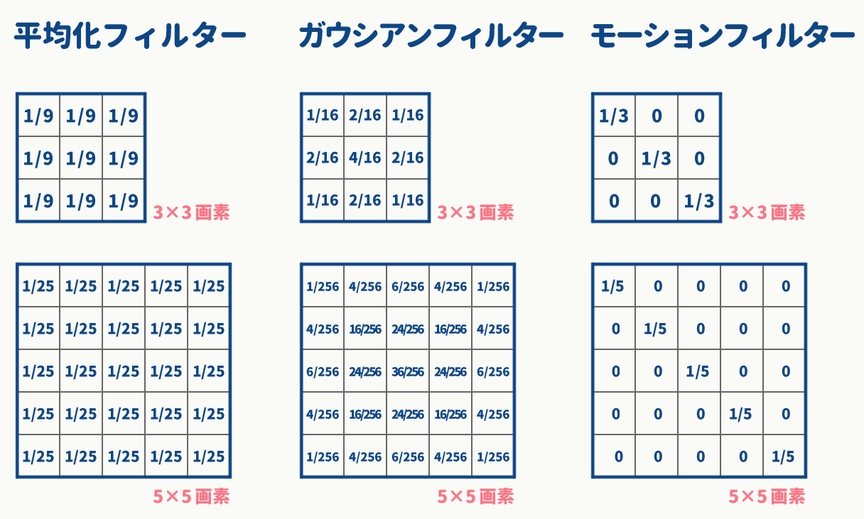 重みの与え方を変えることで様々な平滑化フィルタを作ることができます。ガウス分布の重みを使えばガウシアンフィルター(ガウスぼかし)になりますし、特定方向のみに重みを持たせればモーションブラーのような効果を得られます。
